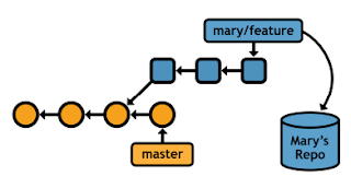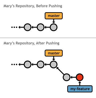For example, executing git push mary my-feature in your local repository bind your my-feature branch onto mary's master branch -at the node pointed by master- (your repository will be unaffected by the push).
